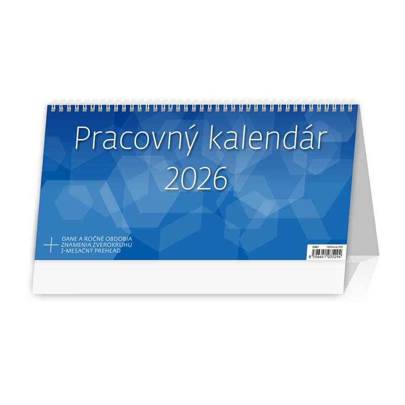 Pracovný kalendár 2026. Formát kalendára: 30,1 x 14,8 cm. Kalendárium: slovenské týždenné stľpcové. Počet strán kalendára: 56 + 2. Stojanček: s plným dnom. Priestor na potlač: 30,1 x 3,5 cm. + dane a ročné obdobia, znamenia zverokruhu, 3mesačný prehľad