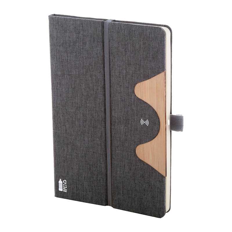 Blok A5 potiahnutý polyesterom RPET s bambusovou vložkou, funkciou stojančeka na mobil a vstavanou bezdrôtovou rýchlonabíjačkou (15W). S 80 linajkovými listami z recyklovaného papiera. Vrátane USB nabíjacieho kábla.
