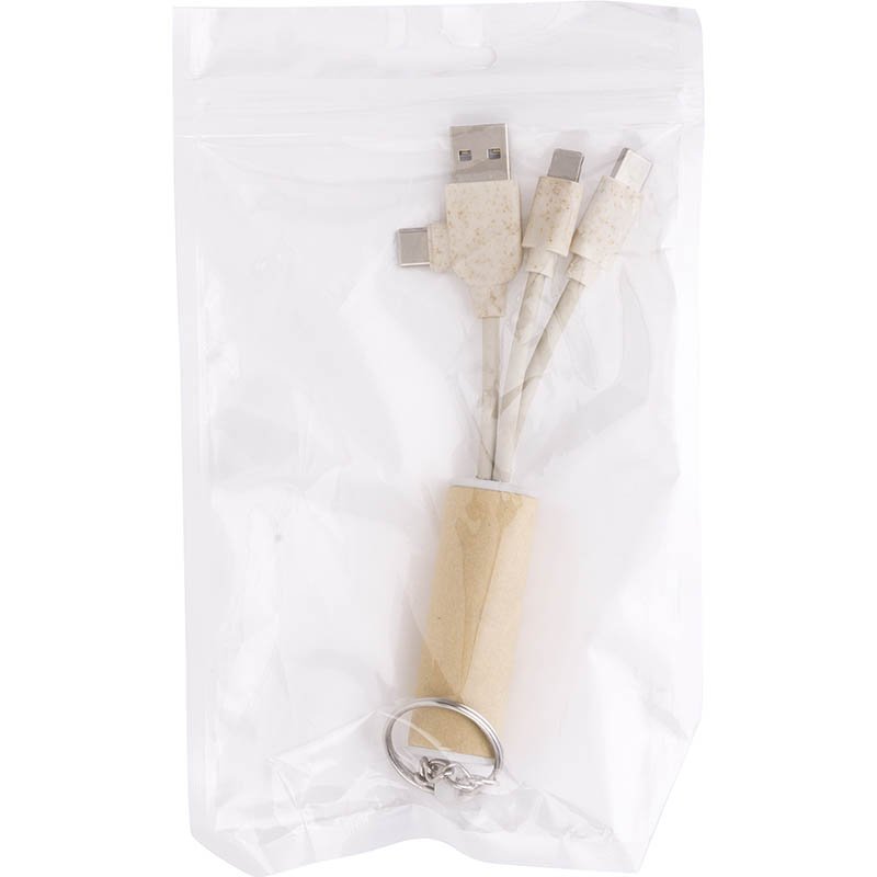 Prívesok na kľúče s USB nabíjacím káblom z recyklovaného papiera a plastu z pšeničnej slamy s konektormi micro USB, USB-C a Lightning. So vstupmi USB a USB-C.