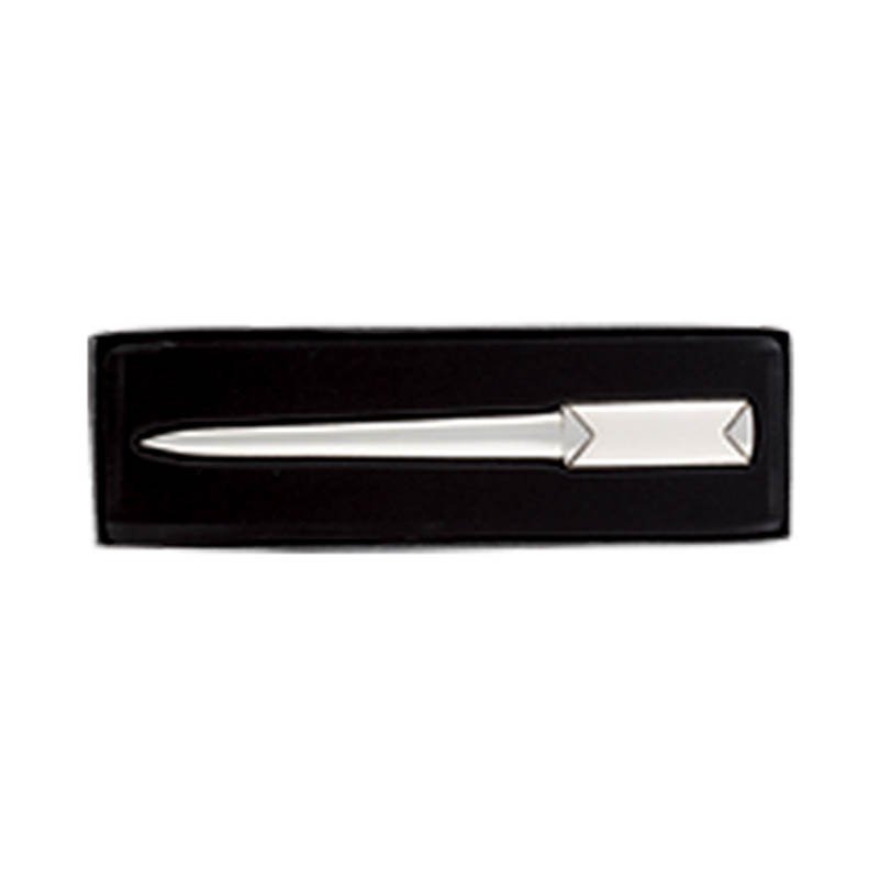 Kovový otvárač na listy v čiernej darčekovej krabičke.