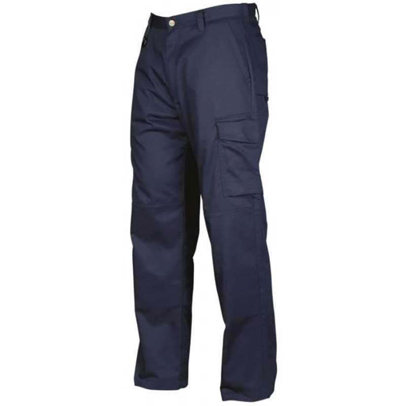 Trousers without front pleat. Side pockets at the front, secure pocket with zip on right and key pocket with D-ring on left. Two back pockets. Two leg pockets. Left leg pocket has a flap and mobile phone pocket inside, loop for ID card holder and a pocket with zip. Right leg pocket has space for a mobile phone, pens, paper and folding rule. Internal knee pad pockets. Loops under back pockets and leg pockets for attaching Inbags. Material: 65% polyester, 35% Cotton. 245g/m2 Colour: Navy-58, Black-99 Size: C44–C62, D84–D120, C146–C156