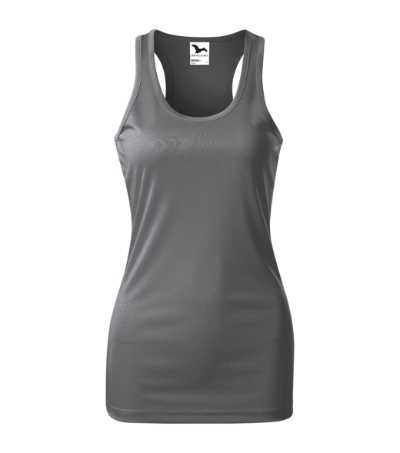 hladký rýchloschnúci materiál, zľahka vypasovaný strih s bočnými švami, vykrojený zadný diel tielka (racerback), hrubší guľatý výstrih, priekrčník a prieramky lemované povrchovým materiálom, ideálne pre šport a pohybové aktivity, materiál vhodný pre subli