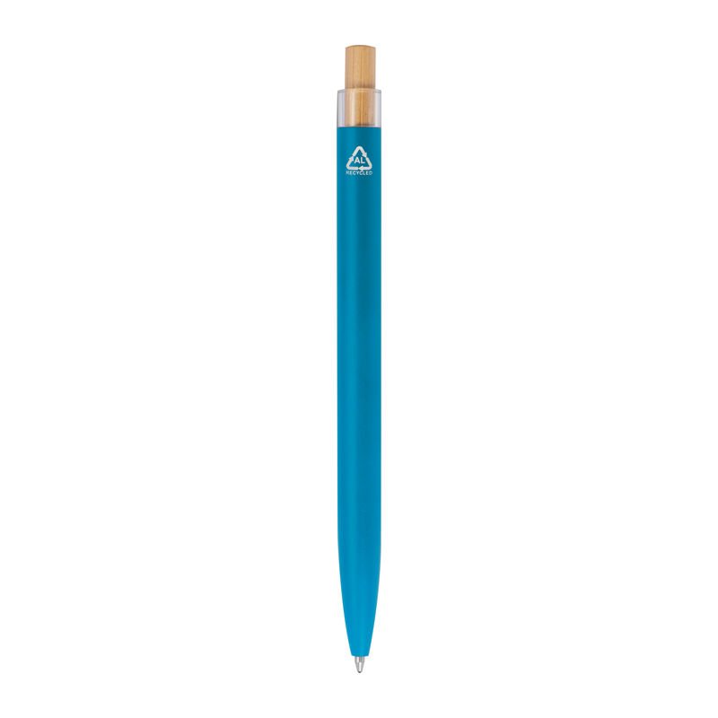 Kuličkové pero z recyklovaného hliníku s bambusovým tlačítkem a barevně sladěným kovovým klipem. Modrý inkoust.