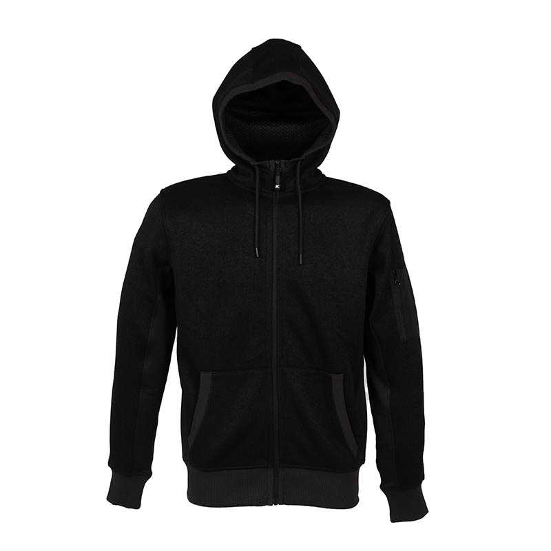 Knitted fleece with inserts in elastized fabric - 100% polyester fabric internally raised fabric - Perforated fabric lining on the front and on the hood - Drawstring hood with stretch rib trim - Contrast internal neck reinforcement tape with hanging hook - Stretch fabric inserts on the hips and inside of the arms - Long zip - YKK zip - One kangaroo pocket with stretch rib trim - One arm pocket with zip - Elastic ribbed cuffs and hem