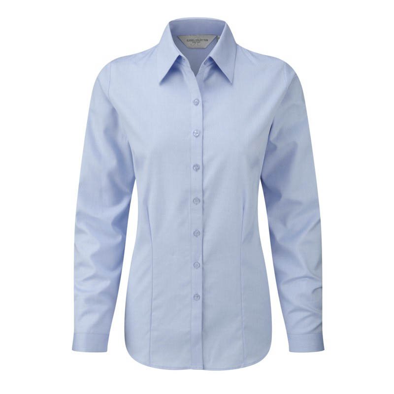 Mini herringbone. Neat, modern collar. Narrow placket. Fitted style. Chest, front and back darts. Narrow cuffs with extended gauntlet. Curved hem. Available in short sleeve 963F seep324. Weight: White: 125 gsm Light blue: 13 Material: 84% cotton/16% polyester. Značka : RUSSELL COLLECTION . Materiál : 84% bavlna/16% polyester ; Biele: 125 gs
