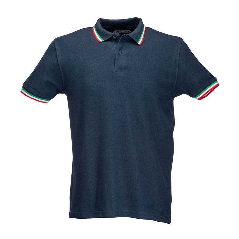 100% piqué cotton (180 g/m2) short-sleeved polo shirt with three-colour trims and two-button collar. Sizes: S/M/L/XL/XXL