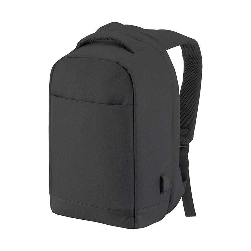 Laptop backpack in R-pet with external USB port. Padded compartment for notebook