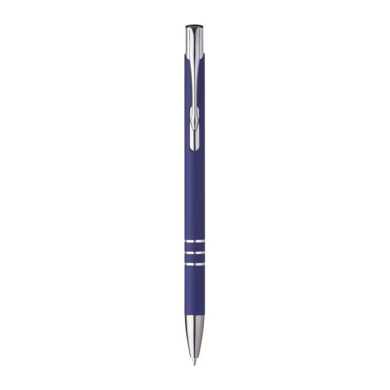 Hliníkové guľôčkové pero so saténovým pogumovaným povrchom príjemným na dotyk a modrou náplňou.