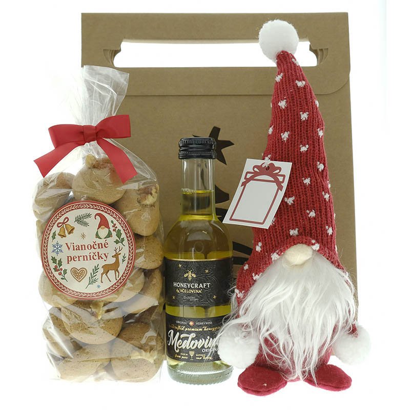 Medovina Originál 180 ml, Vianočné perníky 250g, Vianočný škriatok. Darčeková taška 30x23x10 cm