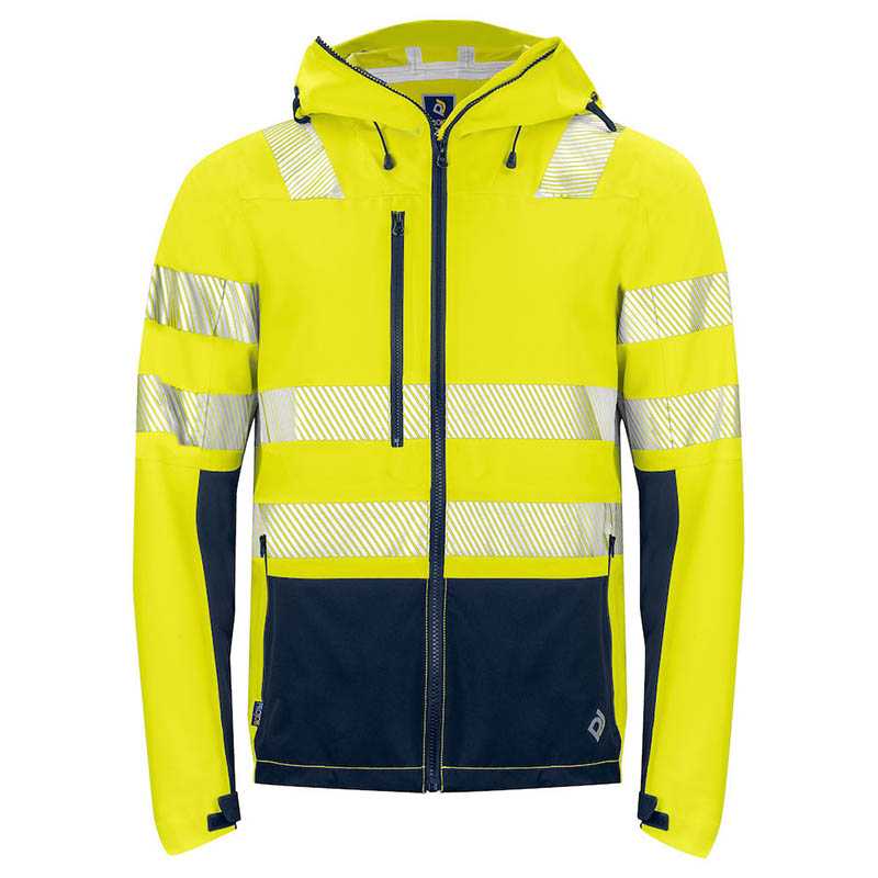 3-Layer wind and waterproof jacket with detachable hood and transfer reflectors. Adjustable drawstring waist. Three laminated pockets with waterproof zipper, one at left forearm and two chest pocket, the left with loop for ID card holder. Two fleece lined side pockets with zip and two large pockets with flap. Double placket with two-way zip at front. Prebent arms with adjustable sleeve end. Material: 86% Polyester, 14 % Polyurethane Safety Class: EN ISO 20471, Class 2 XS, Class 3 S-XXXL Colour: Projob yellow 10, yellow black 11, orange 17 Size: XS-XXXL