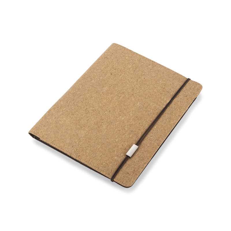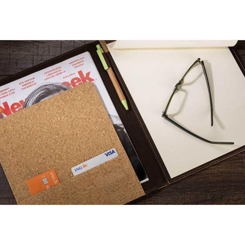 Korková složka A4 s poznámkovým blokem. Obsahuje velkou kapsu na dokumenty, dvě menší kapsy a místo na pero. Uzavíratelný pomocí gumičky s kovovým prvkem. Baleno v netkaném sáčku.