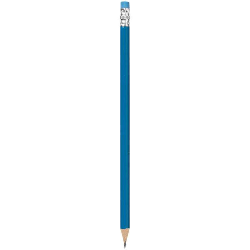 Wooden pencil with graphite lead, cylindrical cross-section, coloured barrel and matching rubber, sharpened