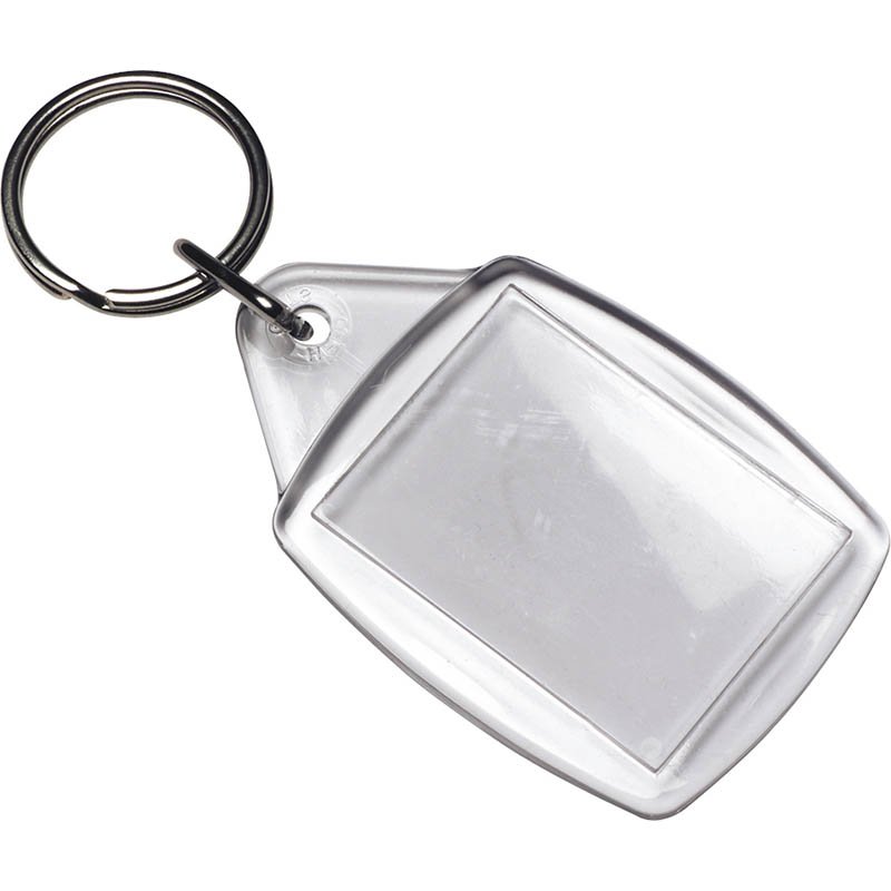 Plastic key holder on metal keyring. Printing is done on a paper insert.