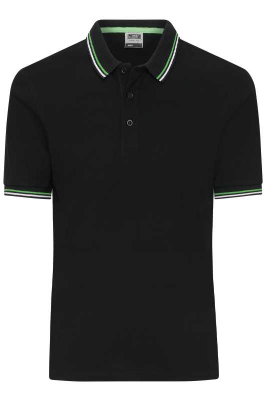 Kvalita.100 % prstencovo spriadaná bavlna.Štýl.Rebrovaný 1 x 1 golier a manžety.Výstužná páska na krku.Krátke rukávy.Kontrastné pruhy na golieri a manžetách.3 gombíky s légou tón v tóne.Priliehavý strih.Strihané a šité.Rázporky naboku.Náhradný gombík na vnútornom šve.