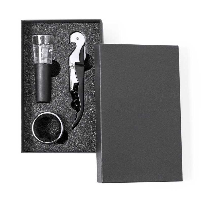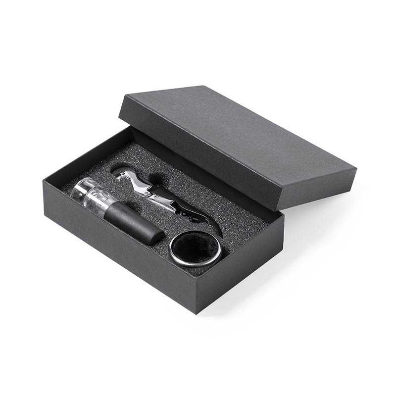 NOVINKA 2025. Ultimate wine set in a sober black finish, presented in an individual case with foam die-cut inside and inside white protective sleeve. Including drip stopper, stainless steel corkscrew and vacuum pump lid.