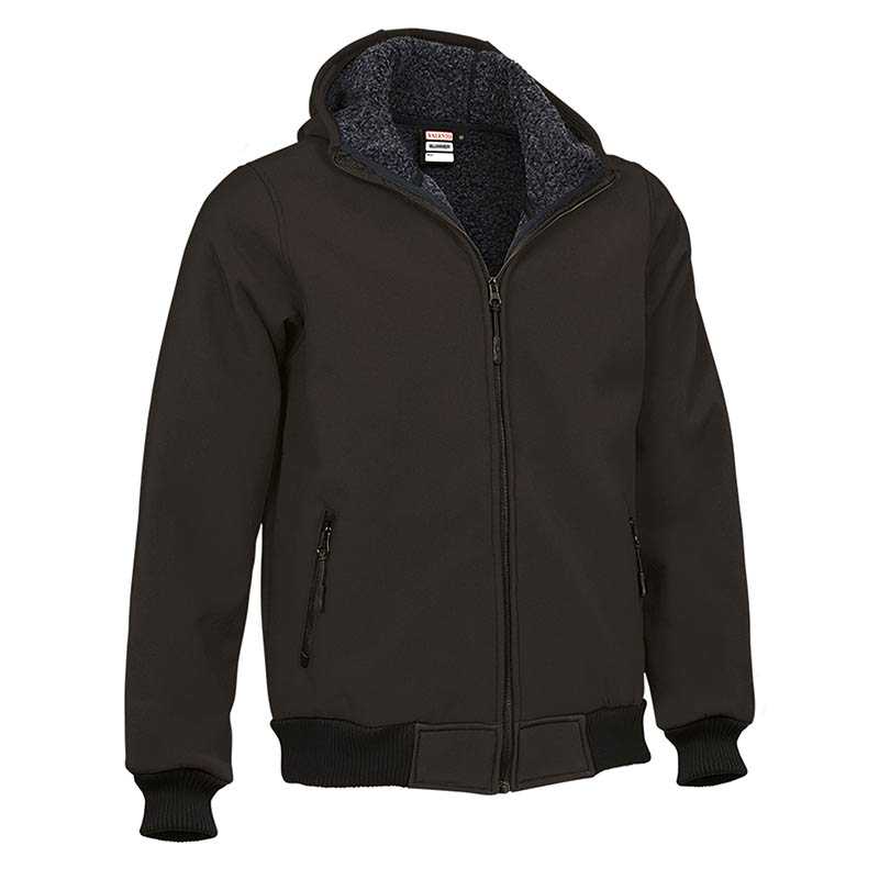 Thick Softshell Hooded Jacket and Two Pockets. Made of extra thick three-layered stretch softshell fabric (a water-repellent outer layer, a breathable mid-layer and a sherpa lining inner layer) providing windproof and water-repellent properties, as well as excellent thermal insulation. Stand-up double layer hooded collar with full-zip front closure for warmth and comfort. Thick elasticated ribbed cuffs and waistband for comfortably fitting.Two slanted zippered waist pockets for a secure and convenient storage.Suitable marking methods: embroidery, stitching and anti-sublimation heat-stickers.Ideal as sportswear, promotional clothing and workwear in cold environments.