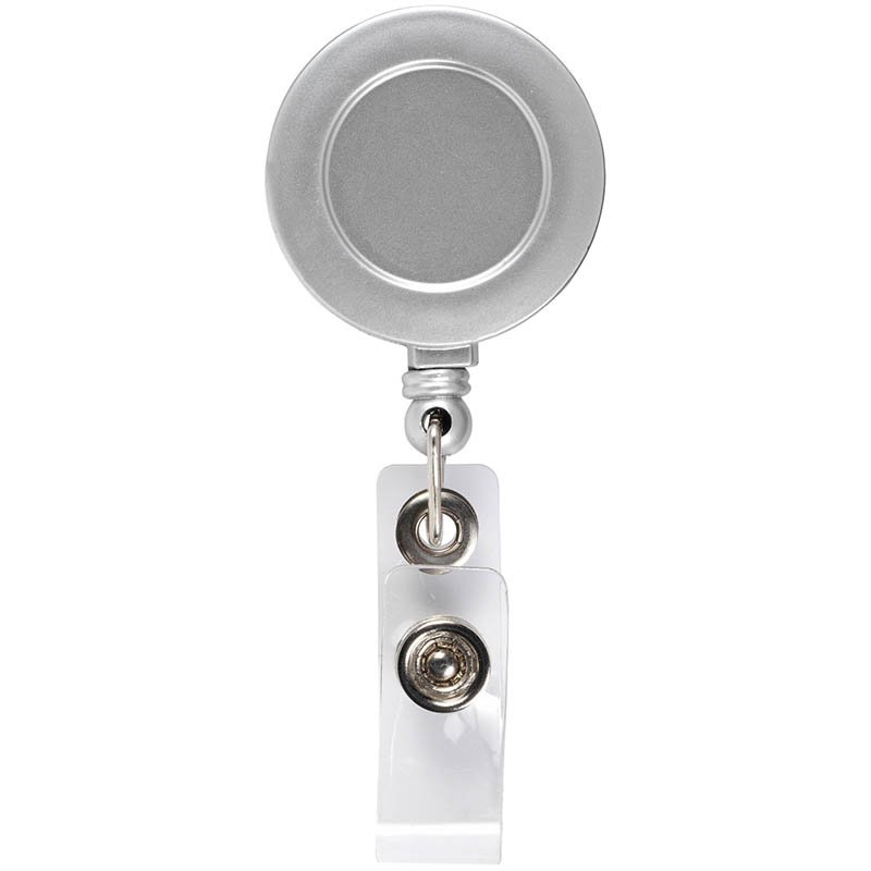Badge/pass holder with metal belt clip, retractable nylon cord and press stud fastener.