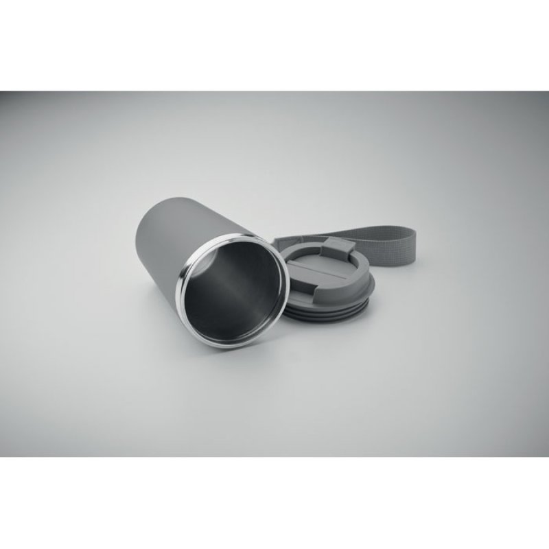 Dvoustěnný kelímek z recyklované nerezové oceli (90 % recyklovaná nerezová ocel a 10 % nerezová ocel) s vnější vrstvou z PP a RPET poutkem na zápěstí. Objem: 350 ml.