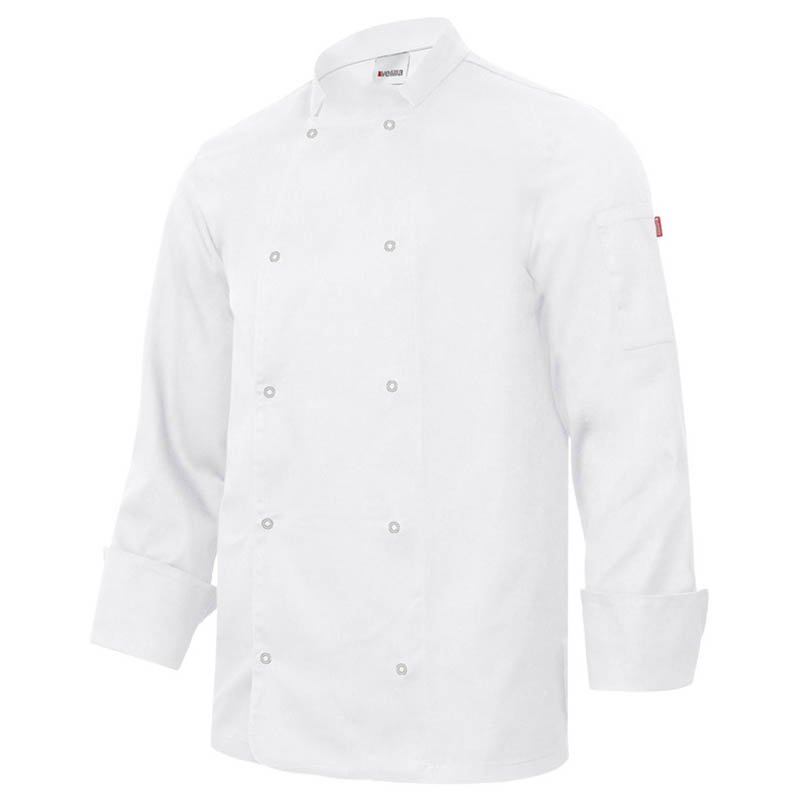 Double-breasted front opening with snap buttons Band collar Tailored sleeves with opening at cuffs Without side seam One pocket: 1 patch pocket on left sleeve