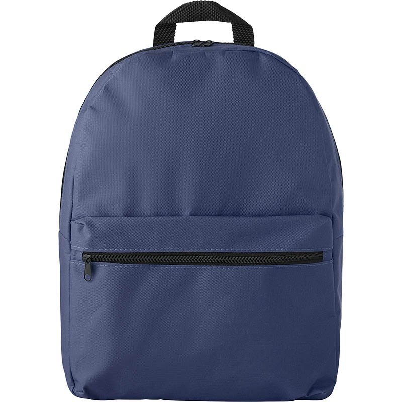 Polyester (600D) backpack with zipper on the main compartment and front pocket. The bag has adjustable, padded shoulder straps.