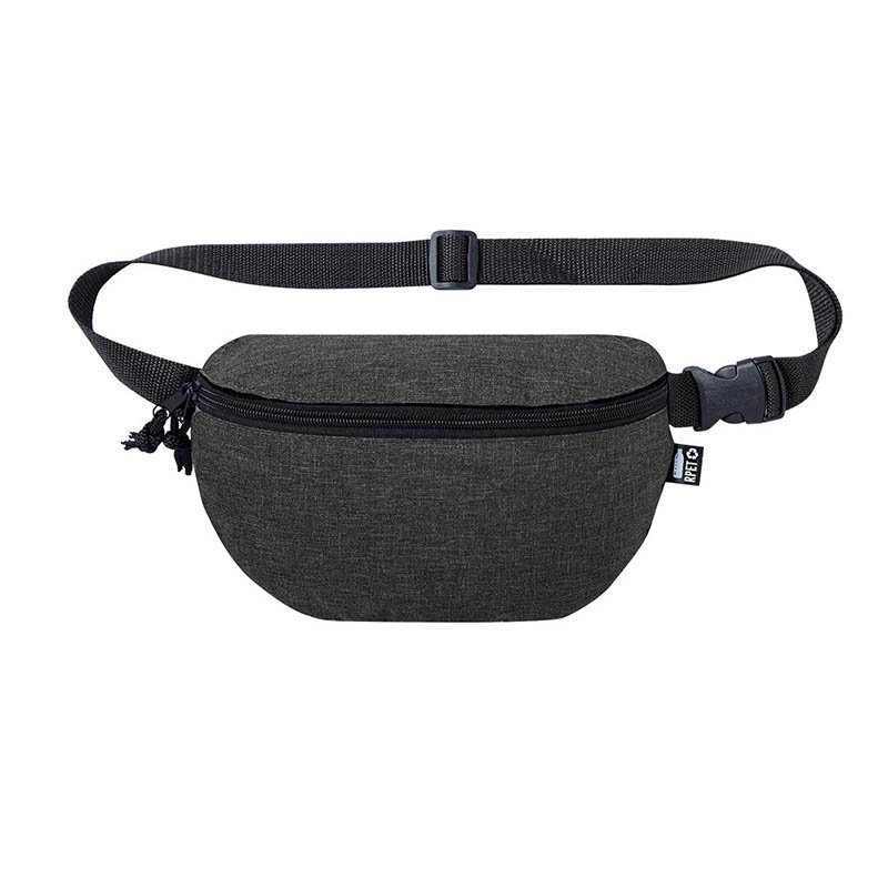 NOVINKA 2025. Nature line waist bag made of resistant 600D RPET, melange effect. Made from recycled plastic to encourage the reuse of plastic waste and contribute to the sustainability of the planet. Main compartment with zip and adjustable strap with buckle closure. Designed for sports and leisure activities, with RPET distinctive on the outside label.