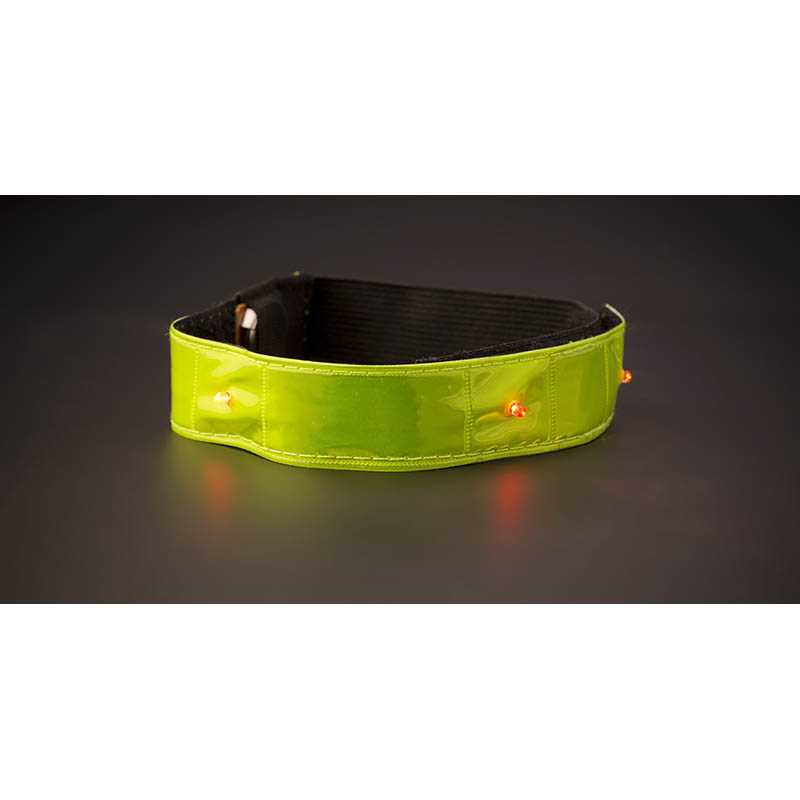 PVC reflective strap with four red led lights and Velcro strip. Batteries included. For promotional use only.