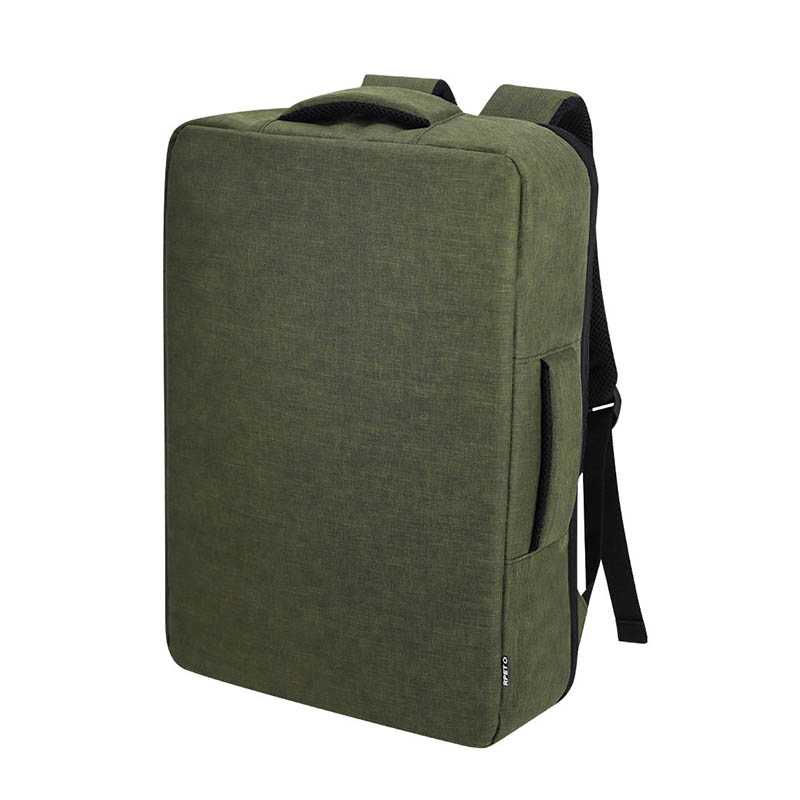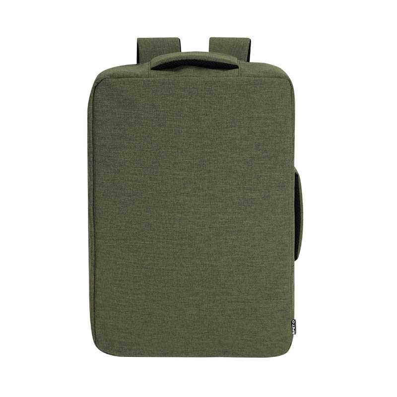 NOVINKA 2025. Document holder backpack made from durable RPET 300D. It features an urban design that incorporates a main pocket with a hidden zipper closure for added protection, with dual pullers. Includes a padded interior for laptops up to 15 inches, additional pockets inside for small items. Its shoulder straps and back are padded and adjustable for added comfort. Offers three transport modes: as a backpack, thanks to the padded shoulder straps; as a document holder, thanks to its carrying handle; and a strap for a trolley. The RPET material is made from recycled plastic, promoting the reuse of plastic waste and helping the planet's sustainability.