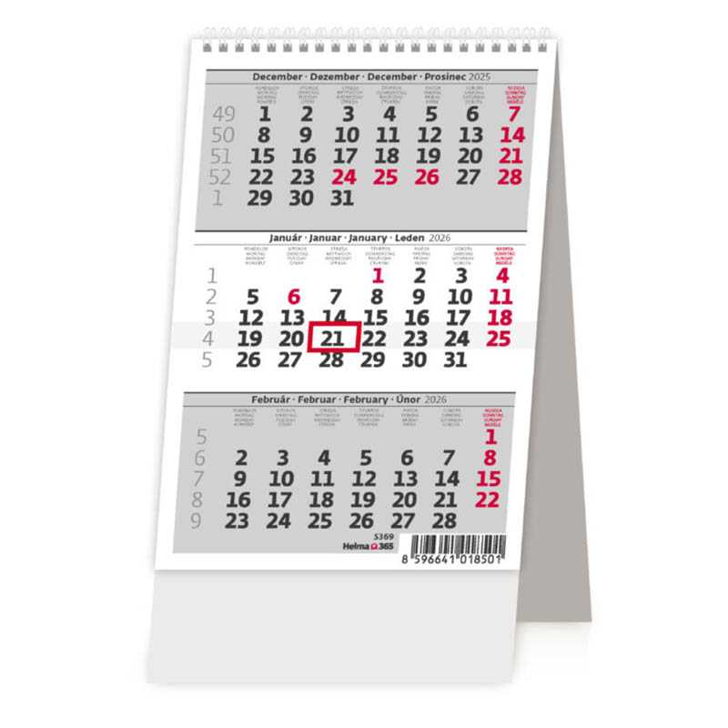 MINI trojmesačný kalendár 2026. Formát kalendára: 11 x 16 cm. Kalendárium: české/slovenské 3-mesačné kalendárium. Počet strán kalendára: 12 (obojstranné). Stojanček: so zámkom. Priestor na potlač: 11 x 3,5 cm