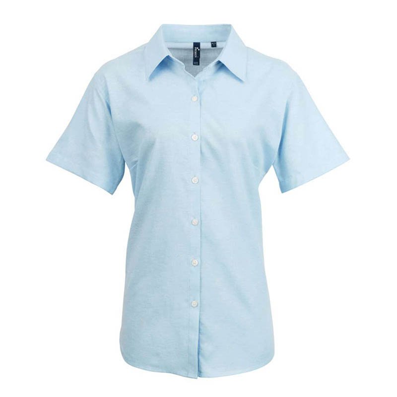 Mäkký golier.Zaoblený spodný okraj.Záševky na prsiach a chrbte.Tkanina s jednoduchou údržbou.Krátke rukávy.Perleťové gombíky na svetlomodrej a bielej blúzke.Gombíky vo farbe na ostatných.Strih na mieru.Jednoduchá údržba.