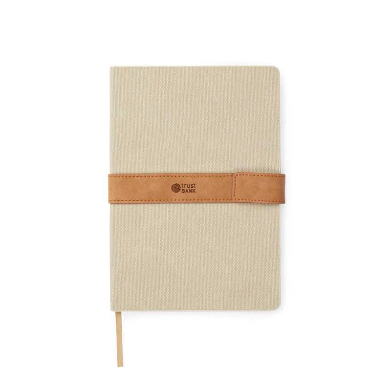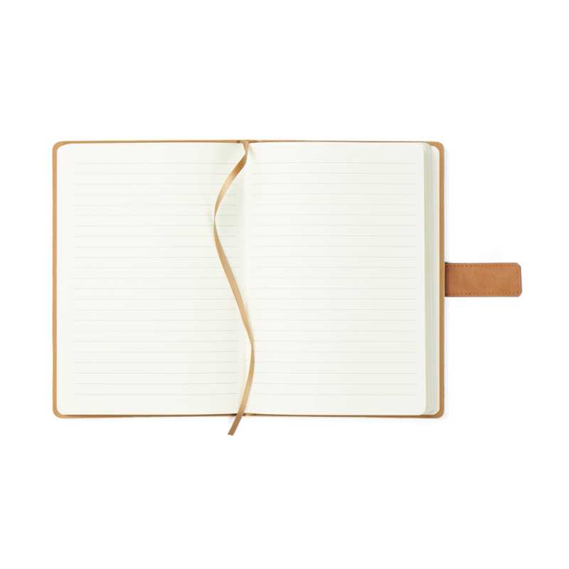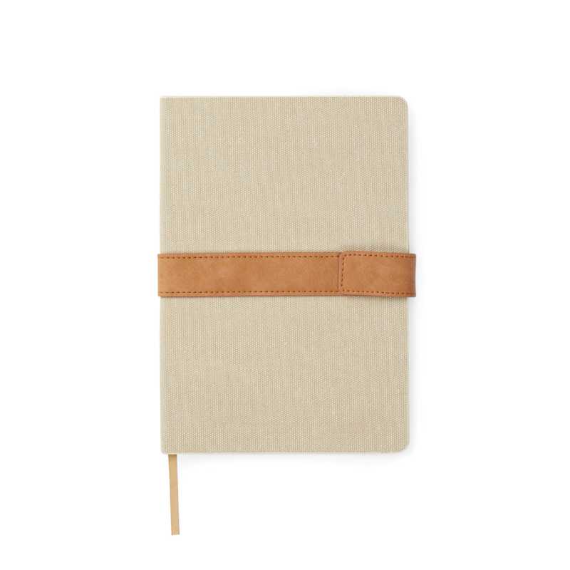 Poznámkový blok velikosti A5 s obálkou z RPET tkaniny. Obsahuje 96 listů linkovaného recyklovaného papíru 70 g/m2 se stuhovou záložkou a očkem na pero. Lepenkový obal.