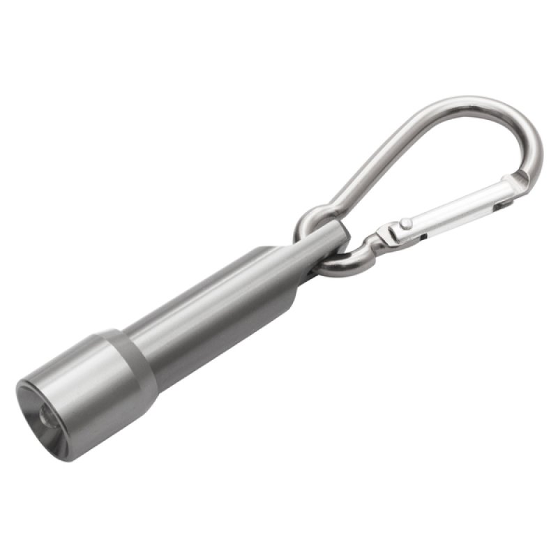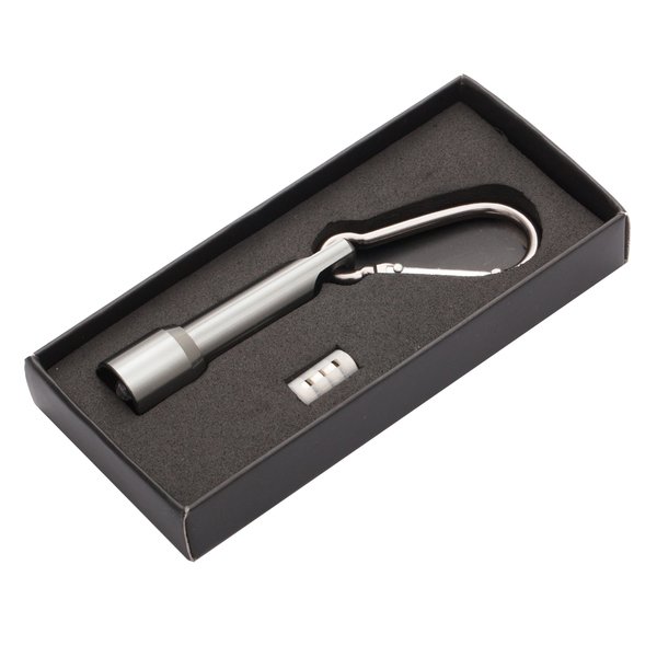 Prívesok s LED svietidlom z kovu s karabínou v darčekovej krabičke. 4 batérie AG3 sú súčasťou.