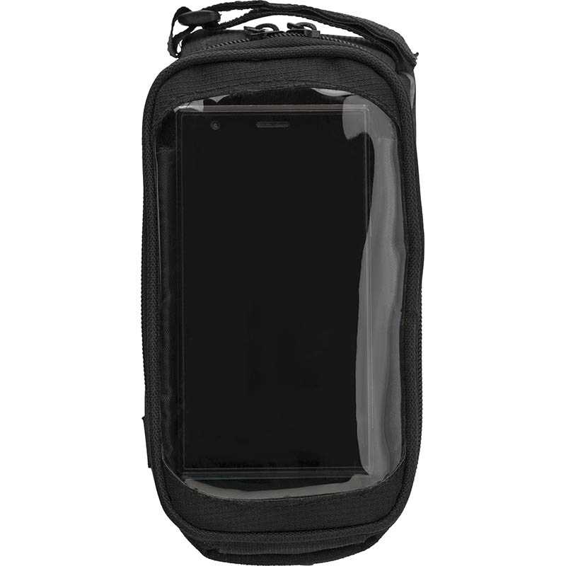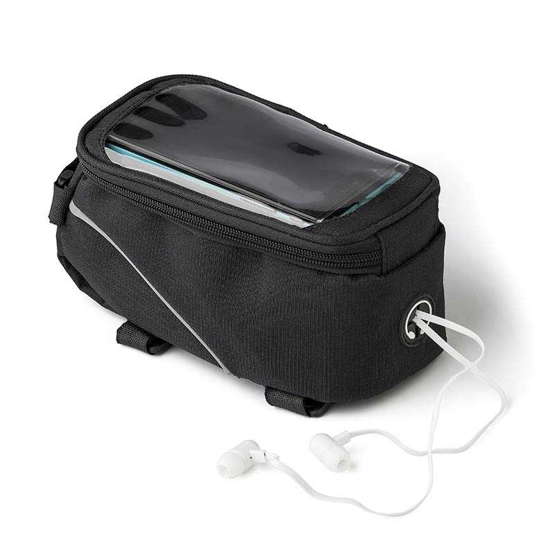 Polyester (600D) and PVC bicycle handle bar bag with separate compartment on top for a mobile phone. The touch screen of the phone can still be used through the PVC cover. On one side there is an opening to pull the cable of earphones through.