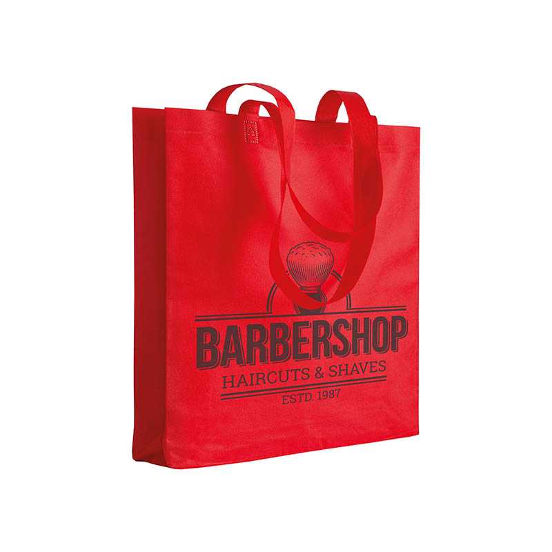 Flat Long-Handled Non-Woven Fabric Bag. Made of lightweight and water-repellent non-woven fabric with embossed finish. Seamless bottom and side seams sewn with strong thread for enhanced durability. Hemmed top contour and handles with heat-sealed cross-shaped reinforcement at the junction point for added strength. With volume of 14 litres and a load capacity of approximately 25kg.Suitable marking methods: screen printing. Ideal for a corporate gift and personalised gift.