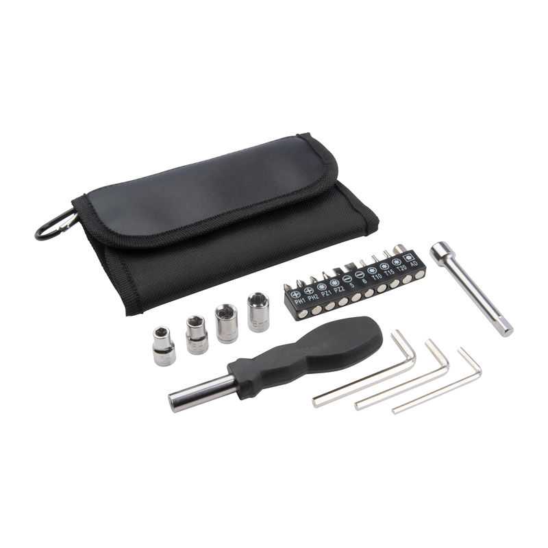 NOVINKA 2025. Tool set of 19 accessories in resistant polyester case with zipper closure. Includes mounting tool, flat screwdriver heads, crosshead and torx type, set of allen keys, wrenches for hexagonal nuts and opener. With metallic carrying carabiner.