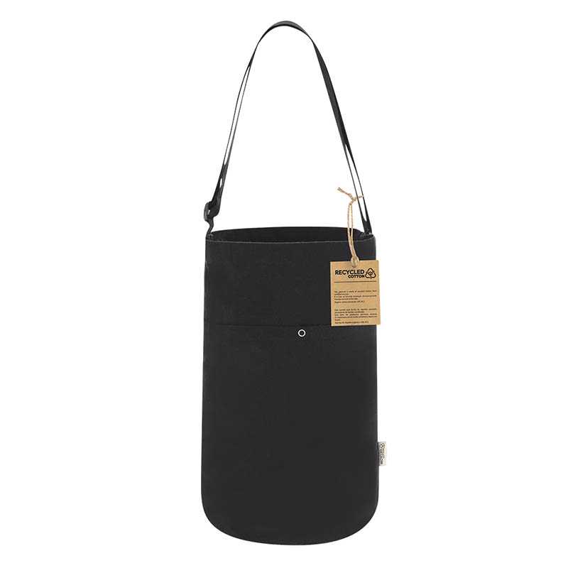 NOVINKA 2025. Bag made of recycled cotton with 270g/m2. Original cylindrical shape with large capacity, with main compartment, auxiliary inner pocket and practical outer pocket with metal clasp closure. Elegant black colour, stitched finish, and an adjustable reinforced long handle. Recycled Cotton logo on outside label.
