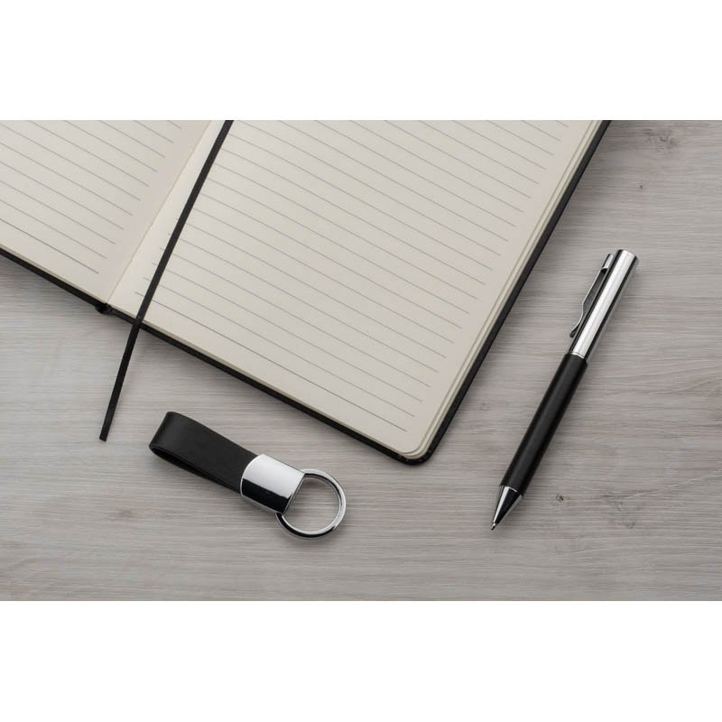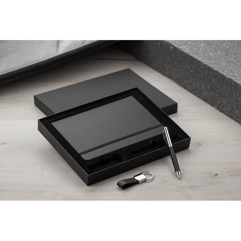 Sada PROBIZ se skládá ze zápisníku, pera a klíčenky. Zápisník má hladké stránky z kamenného papíru, formát A5. Klíčenka je vyrobena z kovu a ekokůže. Kuličkové pero s modrou náplní. Vše je zabaleno ve vkusné černé krabičce. Sada působí mimořádně elegantně.