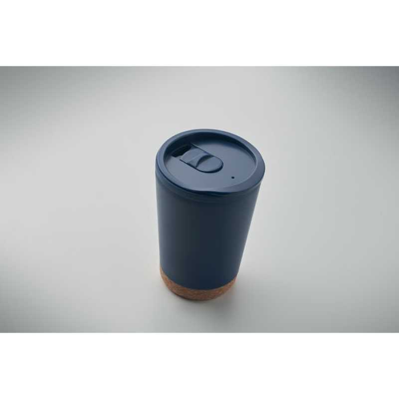 NOVINKA 2025. Dvoustěnný pohárek z PP s korkovým dnem a posuvným uzavíracím víčkem s náustkem z PS a ABS. Objem: 300 ml.