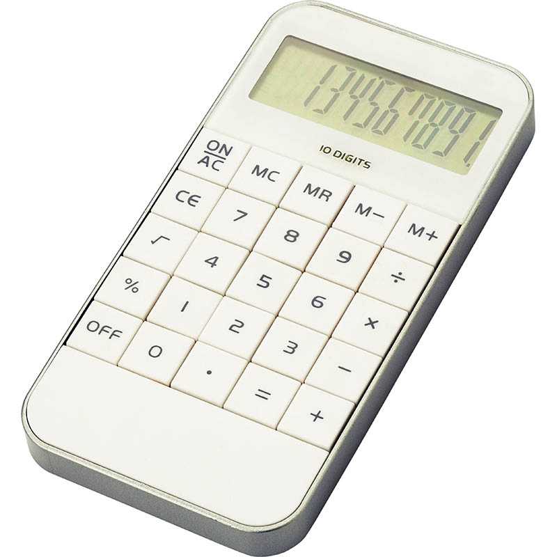ABS mobile phone-shaped, ten-digit calculator with silver coloured rim, including memory, percentage, and square root calculation functions. Batteries included.