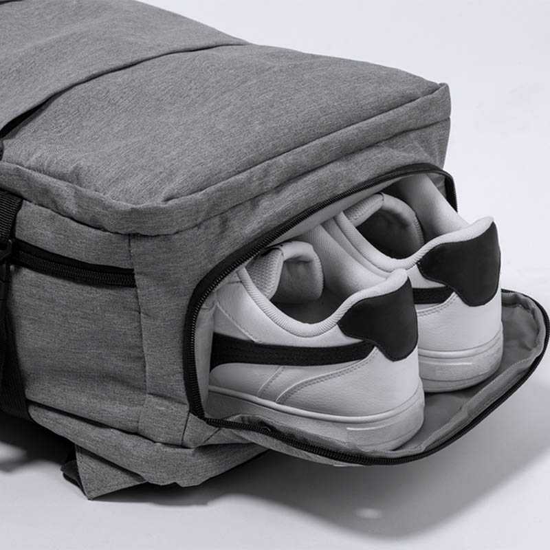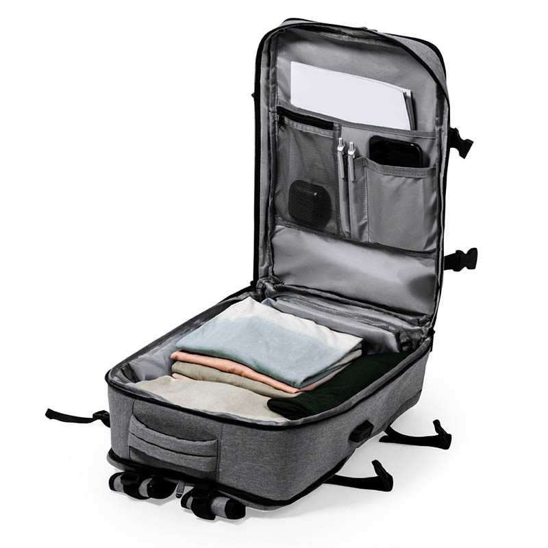NOVINKA 2025. Multifunctional backpack made of 300D RPET. Made from recycled and water resistant polyester, with excellent breathability in the back area, facilitating heat dissipation thanks to its padded straps and padded back. The wide shoulder straps are designed to relieve pressure on the shoulders, enabling the backpack to be worn comfortably for long periods of time.Perfect for any situation, and with multiple compartments: 2 front pockets. 3 large central compartments, one of which is a large compartment, a large central pocket for storing clothes and/or accessories with an organiser inside, and a third padded pocket, perfect for carrying a laptop up to 17.3 inches. It also has 3 special compartments, a side pocket perfect for quick access, a shoe pocket on the bottom with ventilation eyelets, and an anti-theft pocket on the back, plus USB cable. Perfect for travel or everyday use with adjustable straps to suit all lifestyles. Available in black and grey, with RPET label included. Presented individually in a recycled bag.