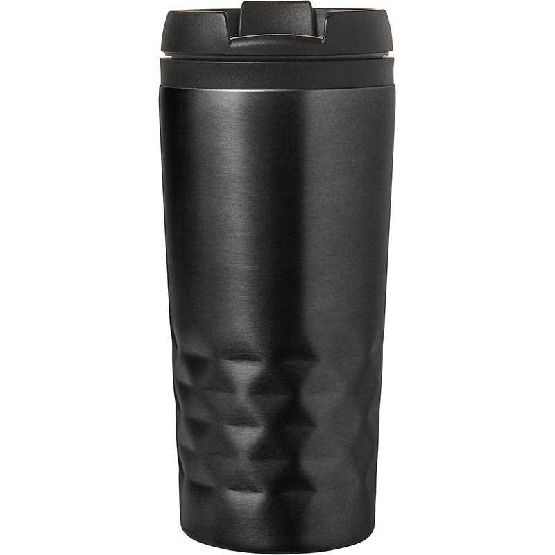 350ml hrnček s vonkajšou stranou z nerez ocele a vnútornou stranou z polypropylénu, s vrchnákom a spodnou časťou v čiernej farbe.