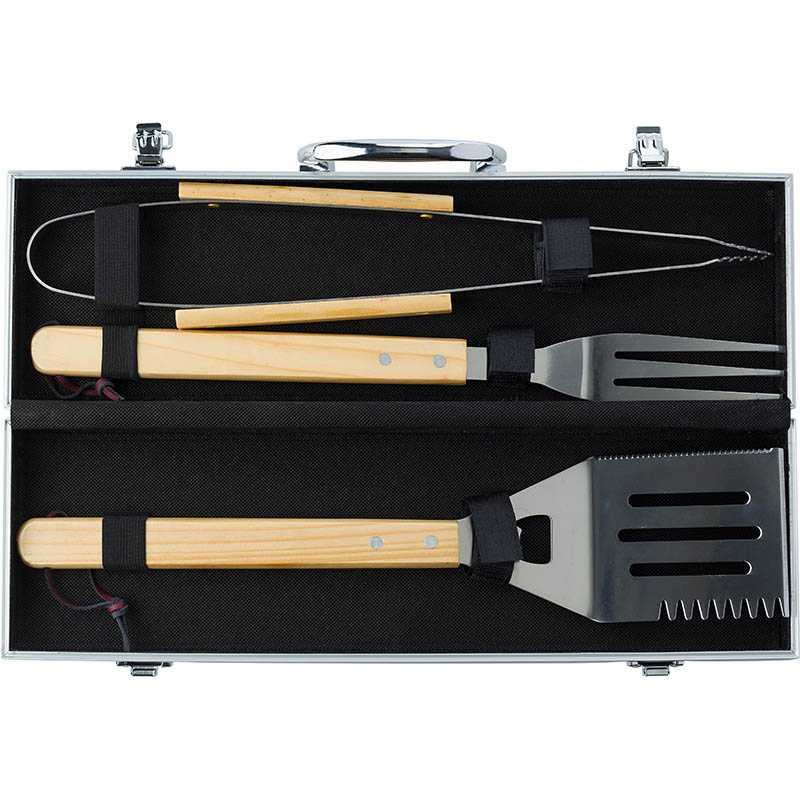 Three-piece barbecue set in aluminium case with bamboo print, including: fork, spatula, and tongs.