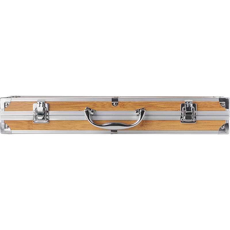 Stainless steel barbecue set in aluminium case, including: eight skewers, four spits, brush, soft brush, carving knife, carving fork, spatula with cutting knife and tongs.