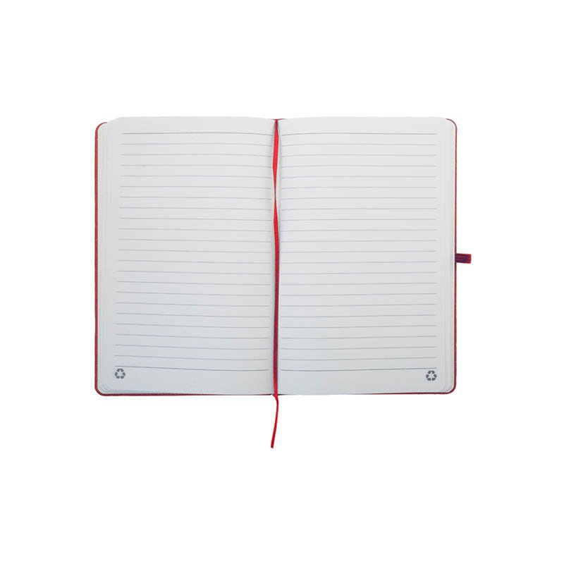 NOVINKA 2025. Zápisník A5 s pevným obalom z recyklovaného polyesteru (100% rPET) 300D a zaoblenými rohmi. Obsahuje 160 riadkovaných strán zo 100 % recyklovaného papiera vo farbe slonovej kosti, oddeľovací prúžok, držiak na biro (nie je súčasťou balenia) a gumičku na zatváranie. Symbol rPET je vytlačený bielou farbou v spodnej časti chrbta. 143 x 211 mm