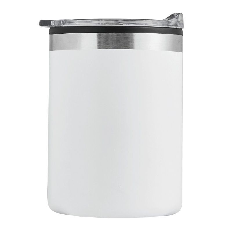 Stainless steel (s/s304), double walled thermos cup (450 ml) with plastic interior and push button on the cap, supplied in a white gift box.