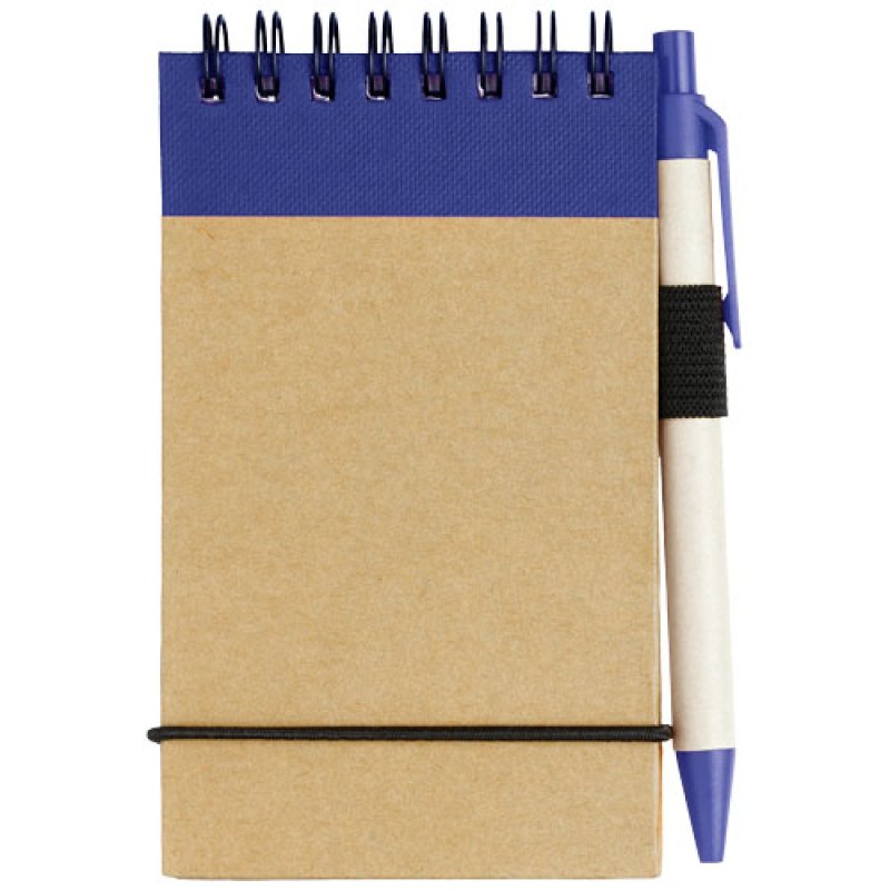 Kroužkový zápisník z recyklovaného papíru s propiskou ve stejné barvě. 140 stran recyklovaného papíru (70 listů) bez potisku. Kuličkové pero z recyklovaného papíru a biologicky rozložitelného plastu. Modrý inkoust. Elastické poutko na pero.