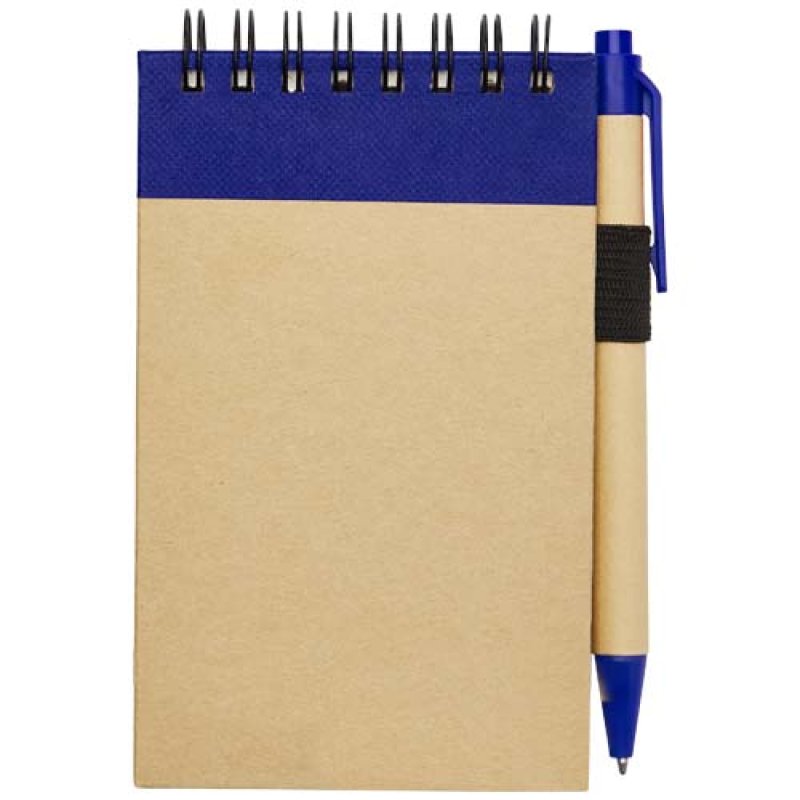 Blok s hrebeňovou väzbou z recyklovaného papiera so 70 linajkovými listami a guľôčkovým perom z recyklovaného papiera s modrou náplňou.