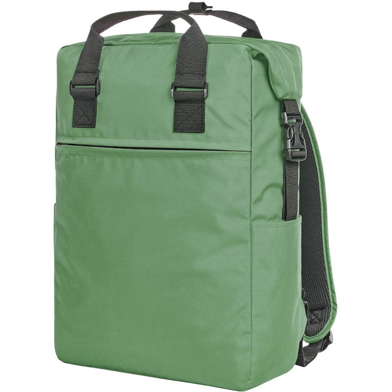 Šarmantní obdélníkový batoh; vrchový materiál RPET; prostorná hlavní přihrádka s 2cestným zipem; polstrovaná přihrádka na notebook; plochá kapsa uvnitř; boční přezky pro pohodlné otevírá