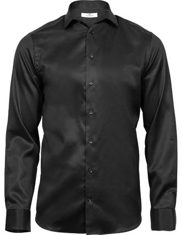 Přiléhavá pánská strečová košile. Knoflík pod límcem s neviditelným umístěním knoflíků a dvěma manžetami na knoflíky. Vypasovaný střih. Podlepený límec a manžety. Sklad vzadu. Záševky na zádech. Zakulacený spodní lem