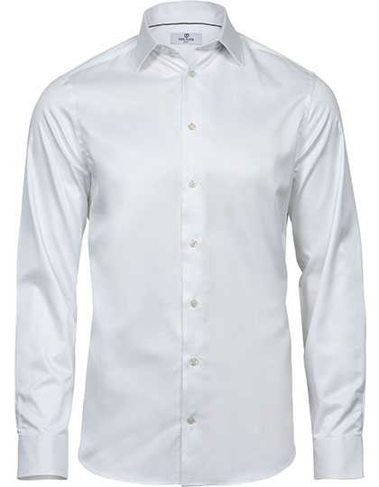 Přiléhavá pánská strečová košile. Knoflík pod límcem s neviditelným umístěním knoflíků a dvěma manžetami na knoflíky. Vypasovaný střih. Podlepený límec a manžety. Sklad vzadu. Záševky na zádech. Zakulacený spodní lem