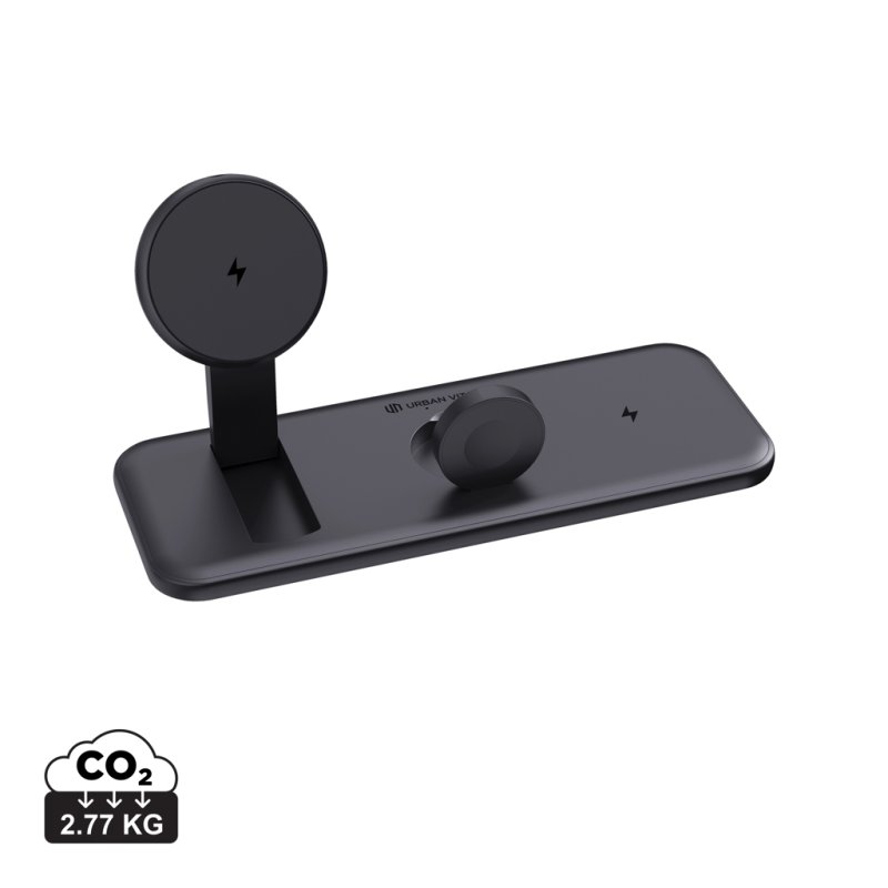 Luxusná skladacia bezdrôtová nabíjačka 3 v 1 ideálna na cesty. Je vybavená magnetickou 15W bezdrôtovou nabíjačkou pre telefón, 5W pre menšie zariadenia (napr. nabíjacia krabička TWS slúchadiel), 2,5W pre chytré hodinky Apple watch. Vyrobené z RCS recyklovaného ABS plastu. RCS (Recycled Claim Standard) je globálny štandard, ktorý umožňuje overiť použitie recyklovaného materiálu v produkte naprieč celým dodávateľským reťazcom. Celkový podiel recyklátu podľa váhy produktu: 46%. Vrátane 120 cm nabíjacieho kábla z recyklovaného TPE. Výrobok je kompletne bez PVC. Balené v FSC kraftovej darčekovej krabičke. Vstup: 9V/3A pre omptimálne použitie. Výstup: telefón: 9V/1,1A, 9V/1,67A (15W); slúchadlá: 5V/1A (5W); hodinky: 5V/0,5A (2,5W).